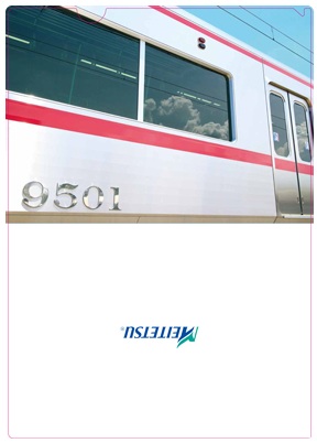 若草色の地に落ち着いた金色の『MEITETSU』ロゴが光ります。