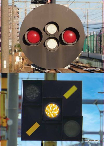 踏切に支障が無いことを知らせる「反応灯」と、線路の終端に設置される「車止標」をデザインしたもので、