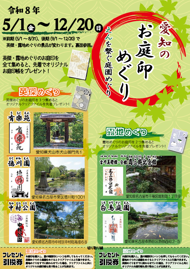 名古屋鉄道が運営する日本庭園「有楽苑」は、徳川園、中村公園、古川美術館・分館 爲三郎記念館、白鳥庭園、丈山苑(後期より参加予定)とコラボレーションし、各庭園で販売している「お庭印」を巡って集める「愛知のお庭印めぐり」を開催します。一部施設では、定番のお庭印に加え、季節限定のお庭印も販売予定です。なお、有楽苑では、初夏と秋それぞれの季節をイメージしたお庭印を新たに制作しました。