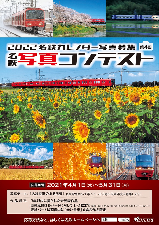 第4回名鉄写真コンテストの結果発表および、それをもとに「名鉄電車カレンダー 四季彩風景」を発売いたします。以前から制作している壁掛型に加え、本年からは卓上型も制作します。それぞれ別の写真を使っており、当社沿線の美しい風景の数々をより一層お楽しみいただけます。