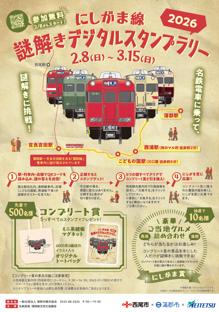 謎解きコンプリートで豪華特典!電車に乗って、西尾市・蒲郡市で謎解きをお楽しみください!