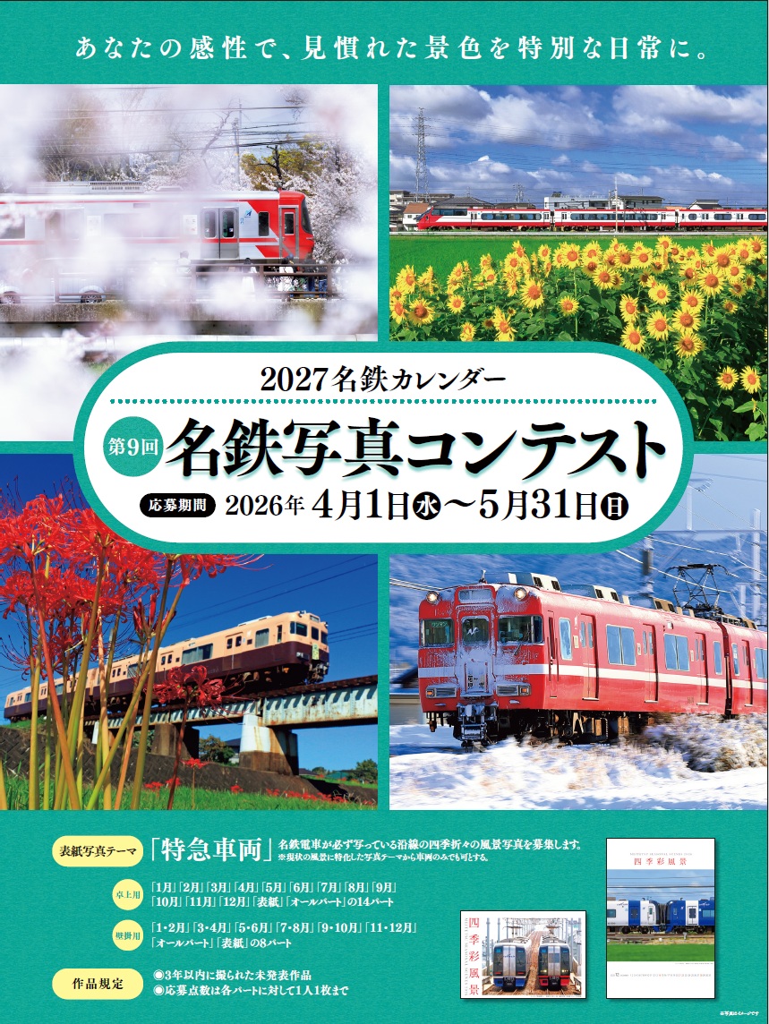 皆様にご応募いただいた作品で「2027年名鉄電車カレンダー(壁掛・卓上)」を制作します。