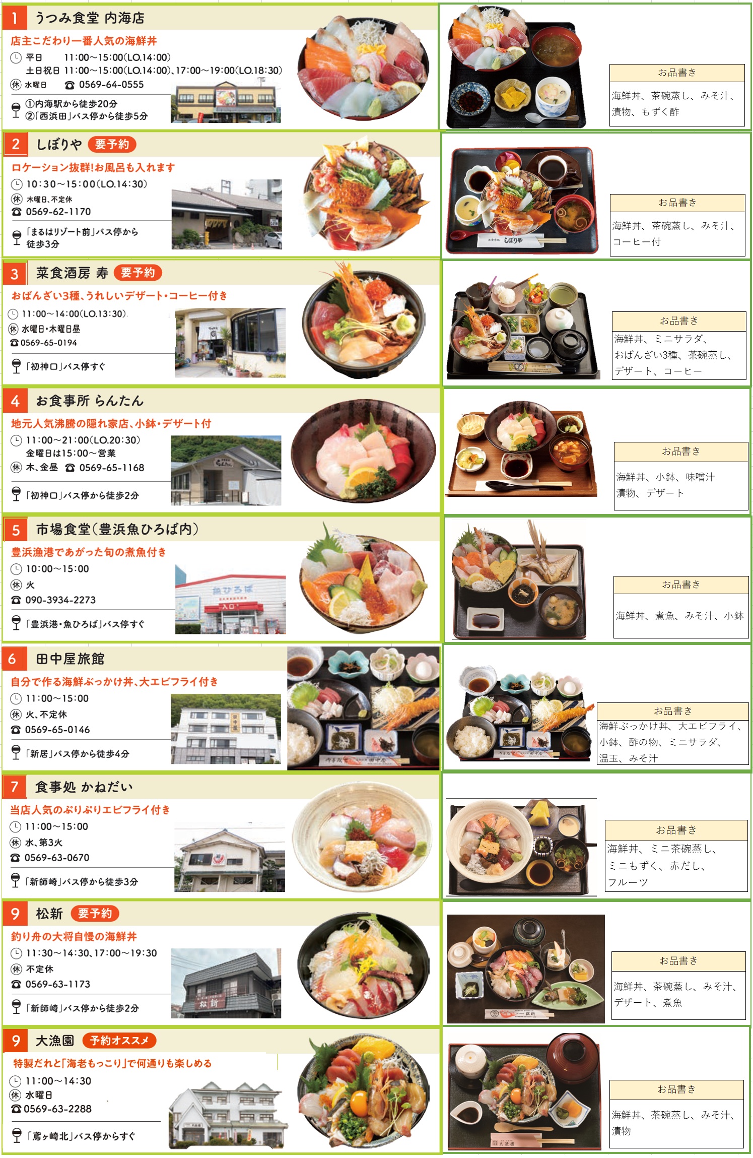 ※②しぼりや ③菜食酒房 寿 ⑧松新は要予約です。⑨大漁園は予約をおすすめします。