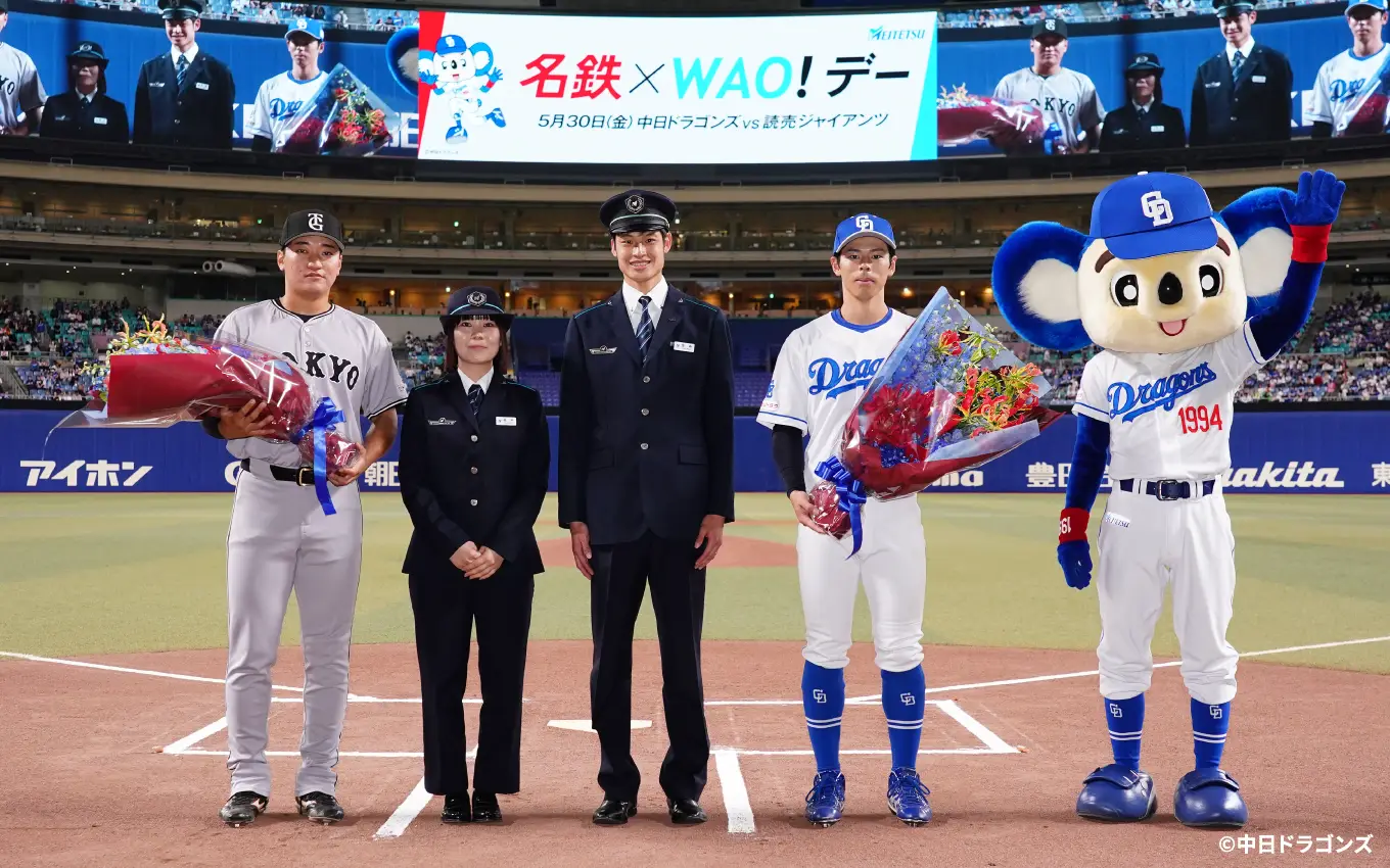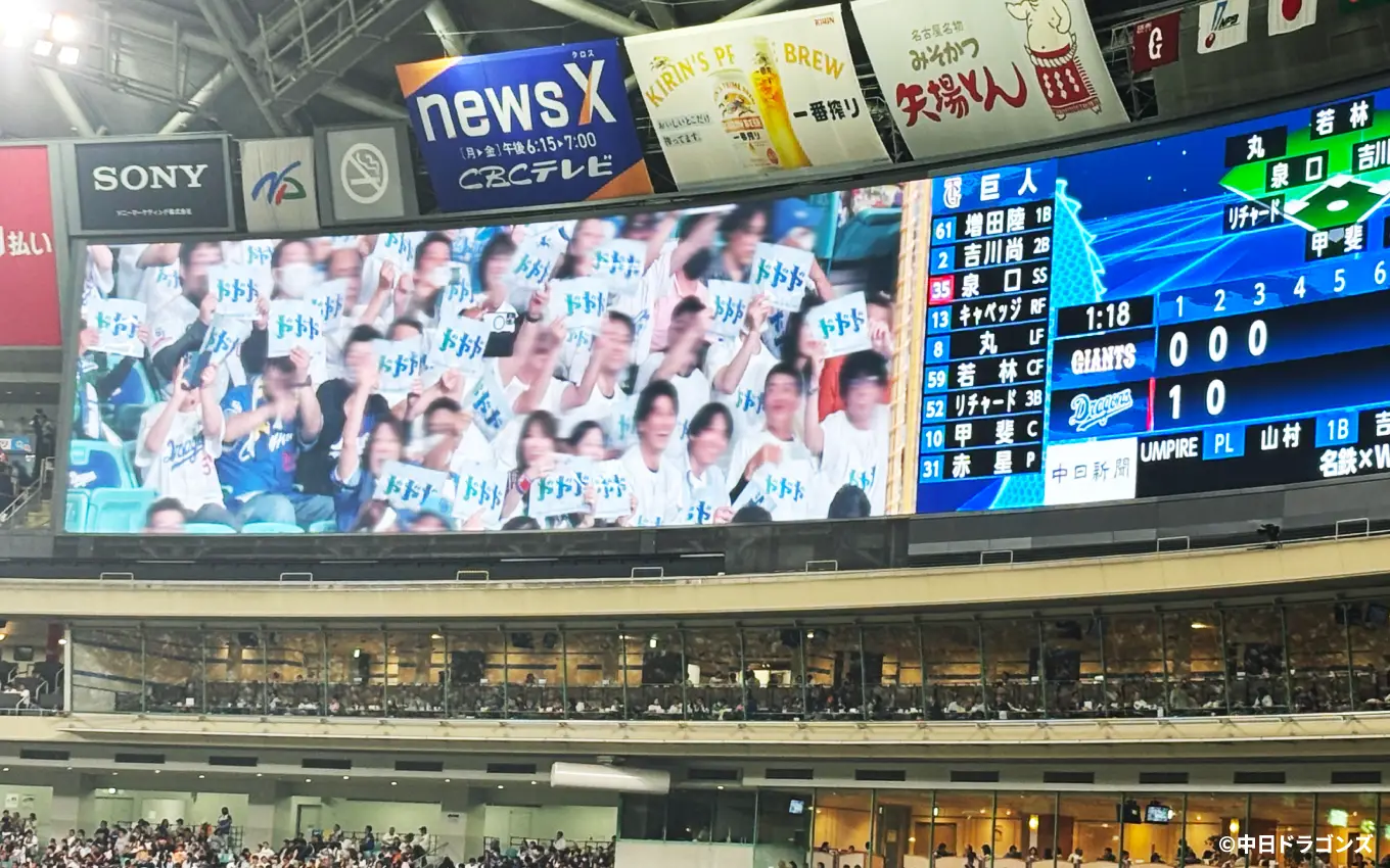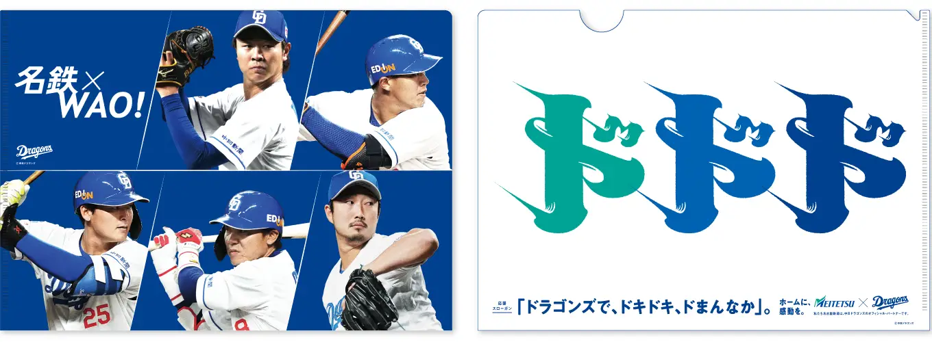 3回裏、来場者記念ノベルティとして配布したクリアファイルと名鉄ミュージックホーンのメロディーを使った、特別な応援を実施しました。