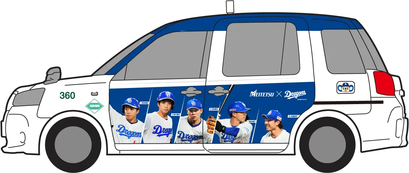 「ホームに、感動を。」というステートメントのもと、中⽇ドラゴンズと地域を盛り上げる施策の⼀環として、「Be the First. 移動を LEAD」を掲げる名鉄タクシーホールディングスと共同で、「中⽇ドラゴンズ応援タクシー」を運⾏します。このタクシーの運⾏を通して、地域のシンボルとしてのドラゴンズの応援機運を⾼めるとともに、皆さまにワクワクをお届けします。