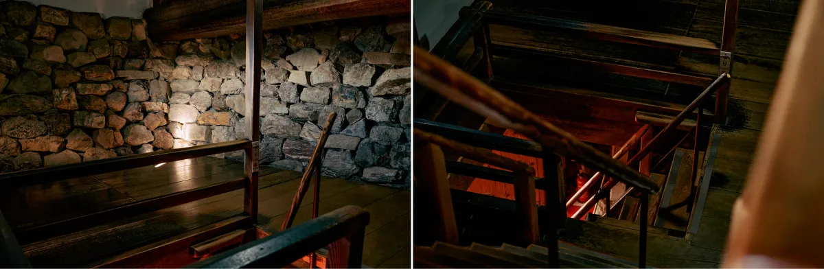 天守に入ると、すぐに階段が現れます。のぼり切った先にあるのは、武骨な石垣が見られる穴倉。そしてその先の階段は、さきほどの階段と直角に折れた位置にあります。これは、侵入してきた敵を横から狙うための工夫だといわれているのだとか。角の位置に立つと、たしかに射線が通っているのがわかりました。