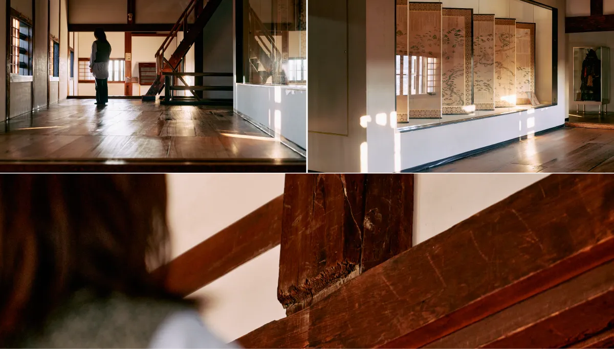 もうひとつ階段をのぼると現れるのが「武具の間」。武器・武具庫として使われていた部屋で、この間を囲む廊下は幅が広く、天井も高い造りになっています。長い槍を持った兵が何人も走り回ってもぶつからないほどの空間。今は何もないはずなのに、足音や掛け声が響いてきそうな、当時の様子が目に浮かびます。
