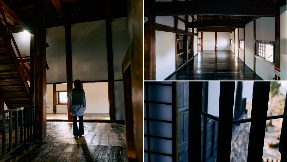 天守内に色濃く刻まれている、歴史の緊迫感も見どころです。たとえば、穴倉からの階段を登ってすぐ正面にある三本の柱。よく見ると、それぞれ削り方が異なっているのが見比べられます。また梁や柱のなかには、丸みや虫食いの跡が残るものも。本来なら木の表面を削り落として強度の高い部分だけを使うはずですが、それがそのまま使われている。これらは美しさよりも速さを優先した証です。城は時間をかけて築くものではありません。敵に気づかれる前に、いかに機能的に、いかに迅速に築けるか。その緊張感が柱一本からも伝わってきて、思わず足を止めて見入ってしまいます。