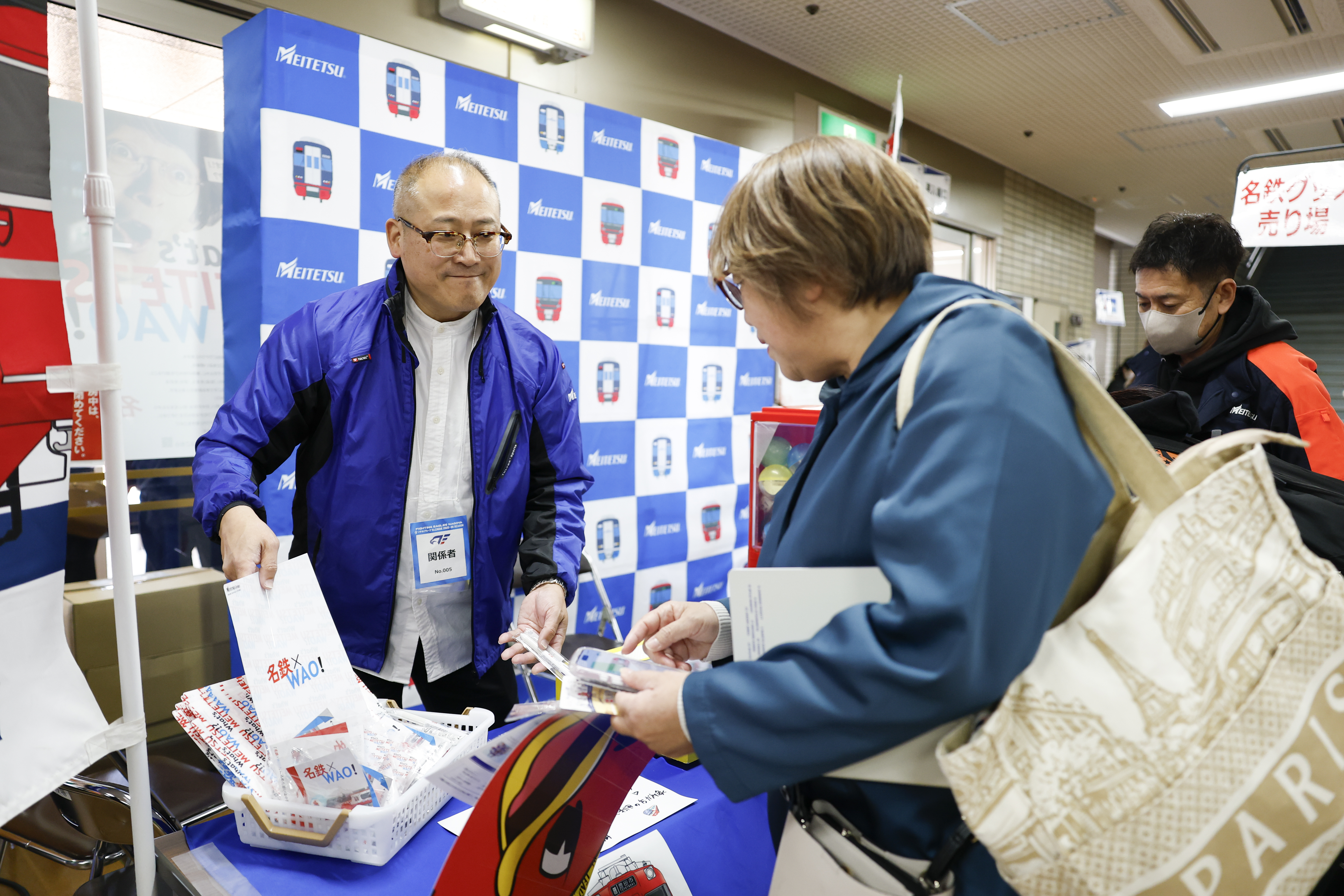 7日(土)限定で、名鉄ブースを出店し、実際に走行する電車に掲出した系統板をデザインしたミニ系統板マグネットや、ファイティングイーグルス名古屋とのコラボタオルや缶バッジを販売しました。また、電車での来場を促進するため、「名鉄電車で来場キャンペーン」を実施し、交通系ICカードを利用してご来場いただいた皆さまに、名鉄×WAO!オリジナルグッズをプレゼントいたしました。