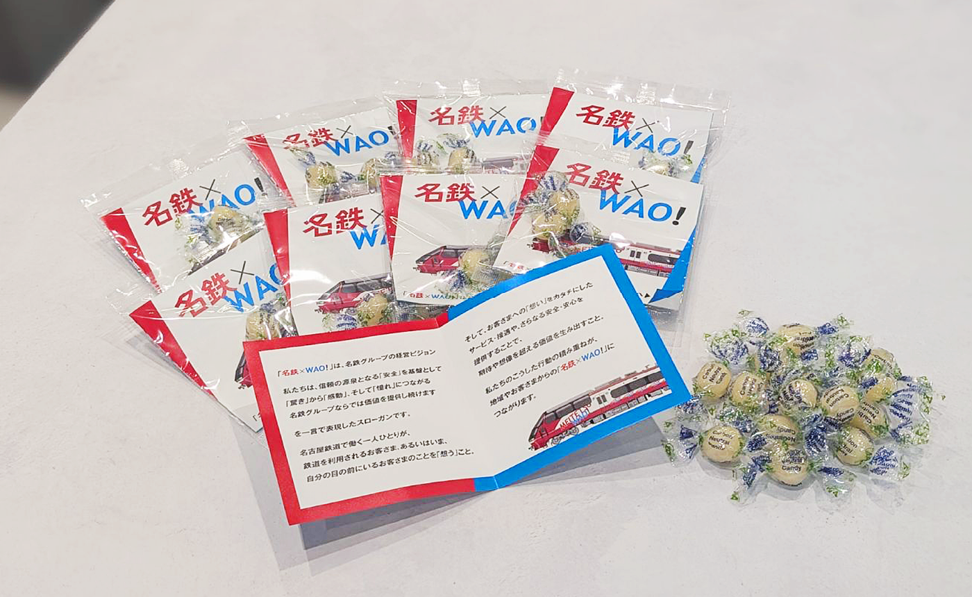 僕たちは、飴を渡すことで会話のきっかけが生まれると考えています。「名鉄×WAO!」に込めた想いを、従業員の皆さんに伝えたいという名鉄さんの要望を聞いて、パッケージに「名鉄×WAO!」のチラシを入れたらより伝わるのではないか?と思ったんですよね。飴を単なる食べ物としてではなく、「メディア」として捉える――。お客さまの想いや企画性をどのように飴にのせるかを大事にしています。