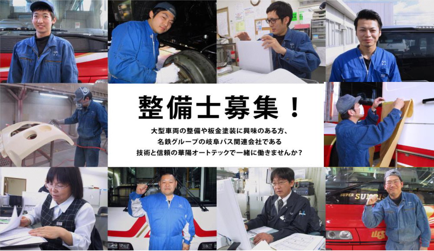 名鉄グループである岐阜バスの関連会社として、主に大型車両(バス)の点検、修理、鈑金、塗装などを行う自動車整備会社です。チームで仕事をするので、未経験者でも安心です。各種資格取得の助成制度もあります。