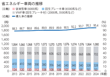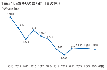 | 当社グループでは、鉄道運行のための電力使用がグループ全体の電力使用量の約3分の2、CO₂排出量についてはグループ全体の約4分の1を占めています。このため、鉄道運行に伴う電力使用量の削減を重要視し、省エネ性能の高い車両への更新を計画的に実施しております。2024年度実績としては保有車両総数1,080両(2025年3月末時点)の約1.5%にあたる16両を新造しています。 |