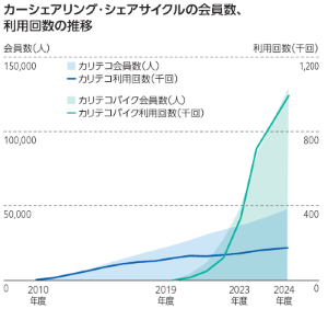 名鉄協商では、2009年度よりカーシェアリングサービス「カリテコ」を展開しています。2025年3月現在でステーション数は488か所、車両台数606台で、東海エリアのほか関東に36か所、関西に37か所、北陸に4か所の拠点がオープンしています。また、2019年度より電動自転車のシェアサイクルサービス「カリテコバイク」を展開しています。事前にスマートフォンなどで会員登録を行い、料金はクレジットカードで精算します。使用した自転車は借りたポートとは別のポートに返却する「乗り捨て」が可能です。2025年3月現在で名古屋市内中心部に523か所のポート、1,323台の電動自転車を展開しており、公共交通機関を補完するラストワンマイルの移動手段を担うとともに、社会全体のカーボンニュートラルに貢献しています。今後も需要と供給のバランスを見据えながら、カリテコ・カリテコバイクともに事業の拡大を図り、シームレスな移動の実現と環境保全への貢献を果たしてまいります。