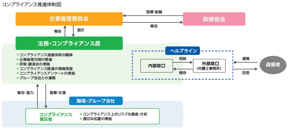 当社は、コンプライアンスに反する行為を速やかに認識し、会社の損害の最小化と再発防止を図るため、当社およびグループ会社の役職員等やその家族を対象とした通報受付窓口を社内および社外(弁護士事務所)に開設するとともに、当社と取引関係にある事業者の役職員等を対象とした通報受付窓口を社内に開設しています(当社お取引先様用内部通報用紙