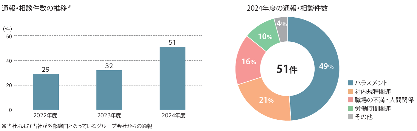 当社では、内部通報制度の認知度を高め、利用を促進するため、各種研修のほか、各部署へのポスター掲出等により周知を図りました。その結果、2024年度の通報・相談件数は過年度を上回る51件となりました。