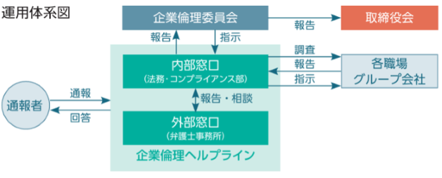 通報事案に対しては、速やかに調査を実施し、適切な措置を講じるとともに、企業倫理委員会で定期的に報告・審議される体制が整備されています。また、通報者の秘密が守られるとともに、その通報によっていかなる不利益な取り扱いも受けないことを規則に定め、適切な対応を行っています。