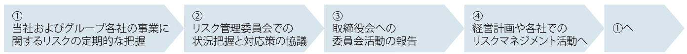 当社グループでは、当社社長を委員長、総務部総括役員をリスク管理担当役員とする「リスク管理委員会」を設置しています。本委員会では、グループ全体のリスク管理の状況を把握し、必要な措置についての審議、事態の発生回避および発生した場合の対応に努めております。リスク管理委員会は監査役会からは独立した組織として運営(リスク管理担当役員は監査役会の議長とは分離)されており、本委員会での協議の内容については取締役会に報告がなされています。一方、取締役会はリスク管理委員会を監督し、リスクマネジメントに関するガバナンス体制を構築しています。