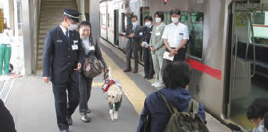 当社は、厚生労働省および特定非営利活動法人「日本補助犬情報センター」と協力し、常滑線大江駅構内において、補助犬(盲導犬・介助犬・聴導犬)ユーザーをはじめ、障がいのあるお客さまに安心して電車をご利用いただくための接遇研修を2024年5月に開催いたしました。これは、2024年4月1日施行の「改正障害者差別解消法」において、民間事業者による障がいのある方への「合理的配慮の提供」が義務化されたことを契機とし開催したもので、中部地区の鉄道事業者21社が参加し、補助犬ユーザーと実際の駅構内やホーム・車両を用いて介助の実技等を学びました。 |