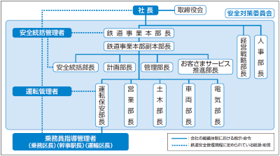 当社では、社長を最高責任者と定め、安全統括管理者、鉄道事業本部長、運転管理者、運転保安部長、乗務員指導管理者および関係部長等の役割を明確にした、安全管理体制を構築しています。