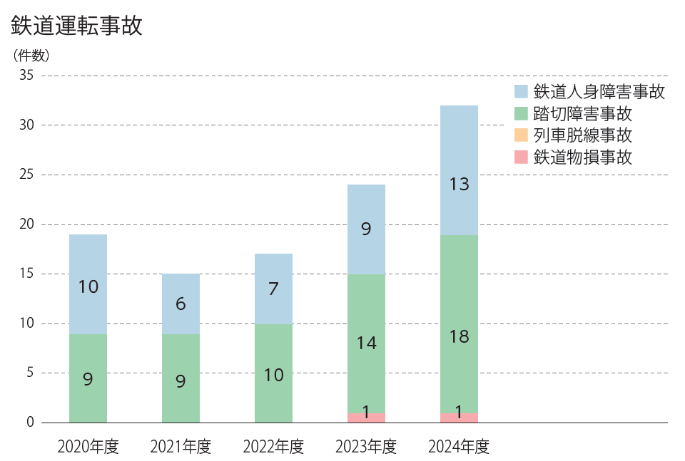 | 鉄道運転事故 | 列車衝突事故、列車脱線事故、列車火災事故、踏切障害事故、道路障害 事故、鉄道人身障害事故、鉄道物損事故 |