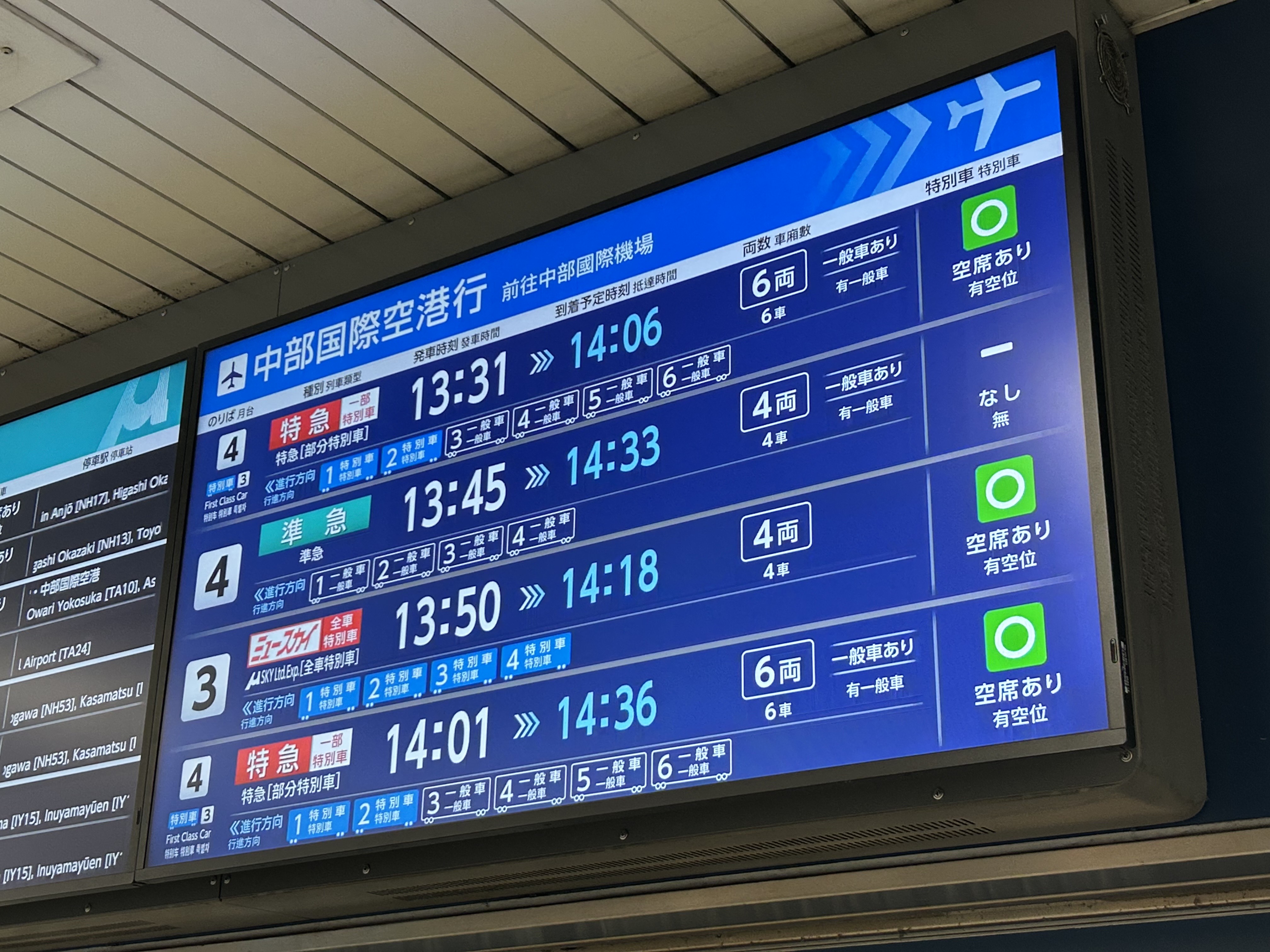 中部国際空港行列車の発車時刻、中部国際空港駅の到着時刻のほか、列車の編成案内、特別車の空席状況等を4ヶ国語でご案内しております。